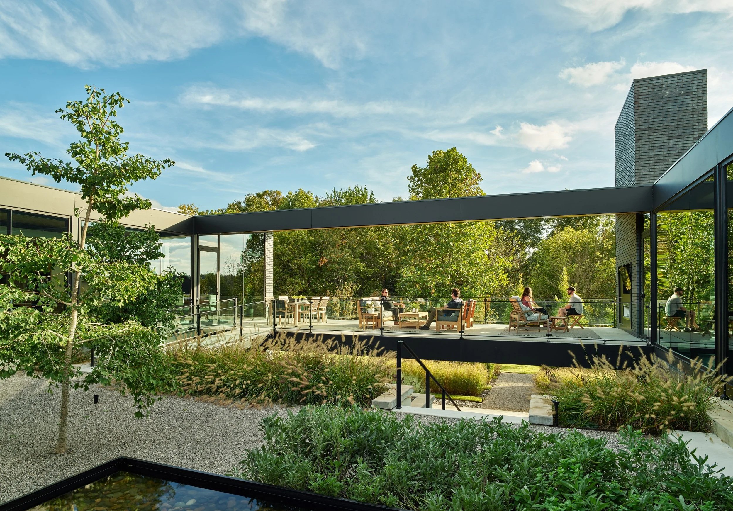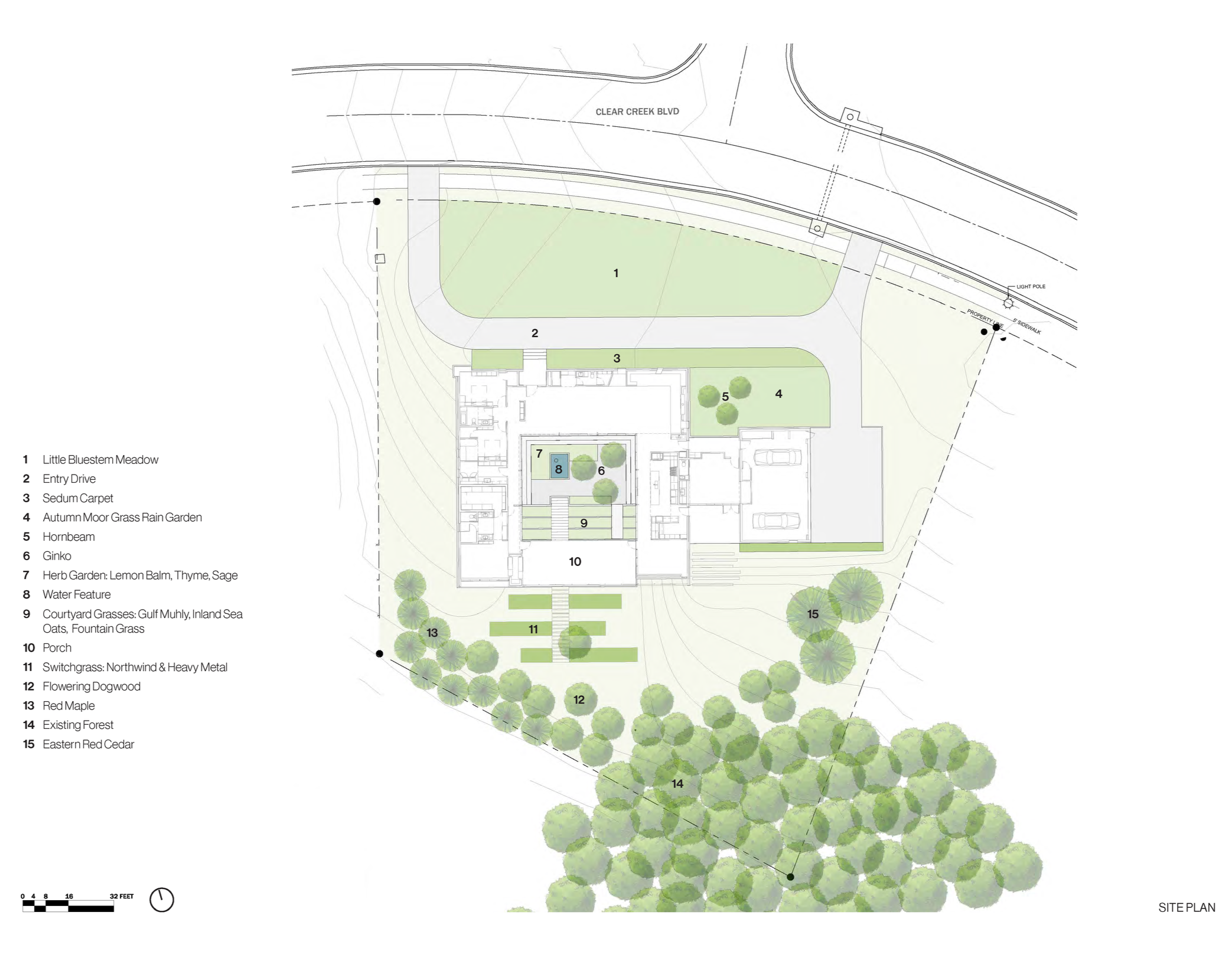 This residential landscape draws inspiration from the grassland ecology of Northwest Arkansas, a stark departure from its surrounding suburban context. A palette of grasses and forbs provides a dynamic setting that changes dramatically through the seasons, while also reducing water consumption and sinking carbon deep into the soil. The central courtyard, surrounded by glass on three sides and an open air “porch” on the fourth, is designed with minimal means for maximum effect. Courtyard plantings and a small water feature provide sensory delight, cooling the main outdoor space in the heat of summer. To the south, an existing woodland edge is augmented with understory plantings to enhance the view.