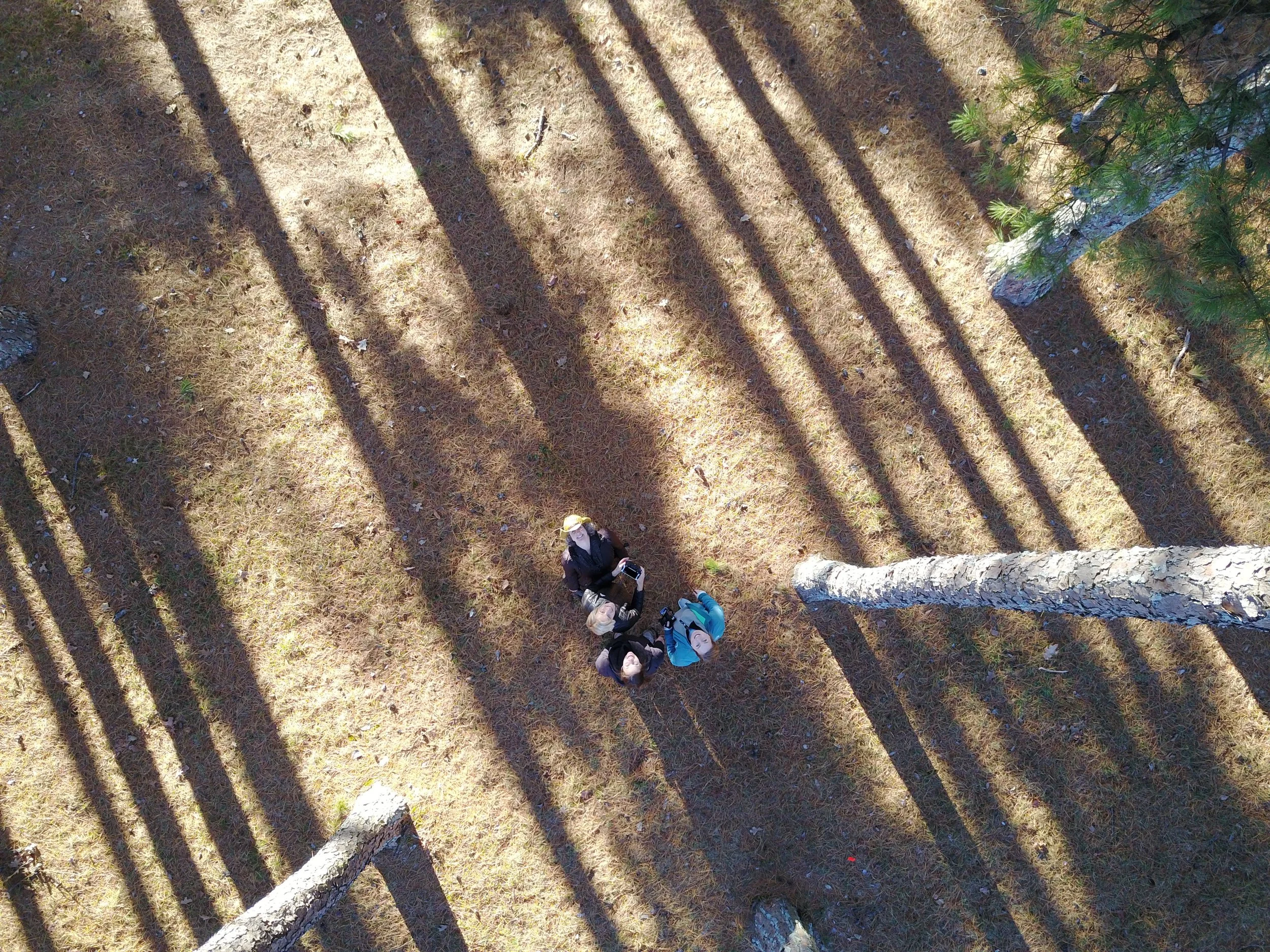 Nine tree cloaks establish a visual and temporal datum in the grove, marking the significance of these trees as potential future hosts for the red cockaded woodpecker. A field of wood stakes mark the expanse of the trees’ root structure, defining both the extent of the rhizosphere below the surface of the ground and the circulation of people through the grove. The diameter of the cloaks is equal to the diameter of short leaf pines at maturity. The cloaks serve as a measure of the growth that will occur between the present moment and the future time of occupancy by the red cockaded woodpecker. The woodpecker excavates the heartwood of shortleaf pine affected by heartwood decaying fungi, which only occurs in trees one hundred years of age or more. If preserved as a managed stand, the trees of this grove could one day be inhabited by the birds and their associated species.