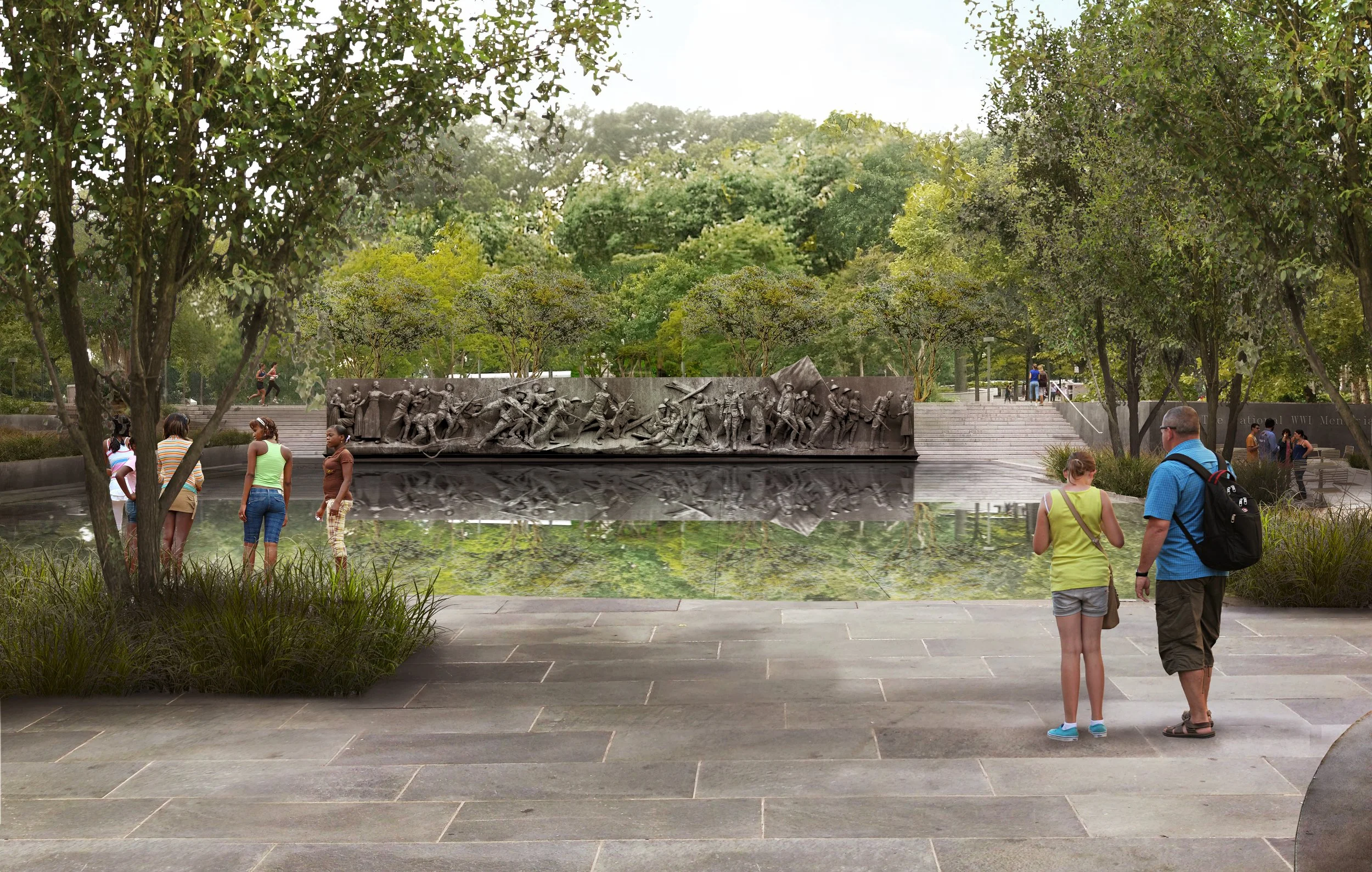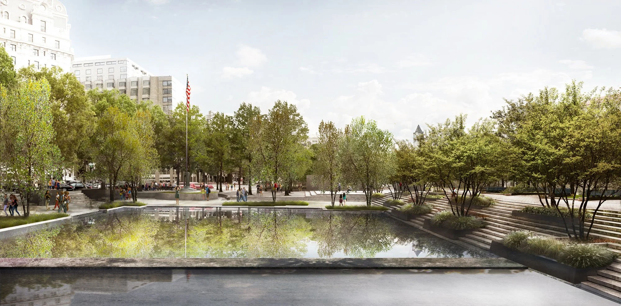 In January 2016, Phoebe Lickwar was selected as part of the winning multidisciplinary team for the WWI Memorial Competition, together with designer Joe Weishaar, sculptor Sabin Howard, and GWWO Architects. Lickwar served as the consulting landscape architect through concept design. The competition scheme proposed by Joe Weishaar and Sabin Howard required iterative and extensive redevelopment to resolve preservation concerns and to sensitively fit the memorial within the existing historic park. Pershing Park was designed in 1979-80 by M. Paul Friedberg with planting re-designed by Oehme van Sweden in 1981. A significant work of modernist landscape architecture, the park was determined eligible for listing on the historic register in July 2016.
